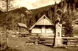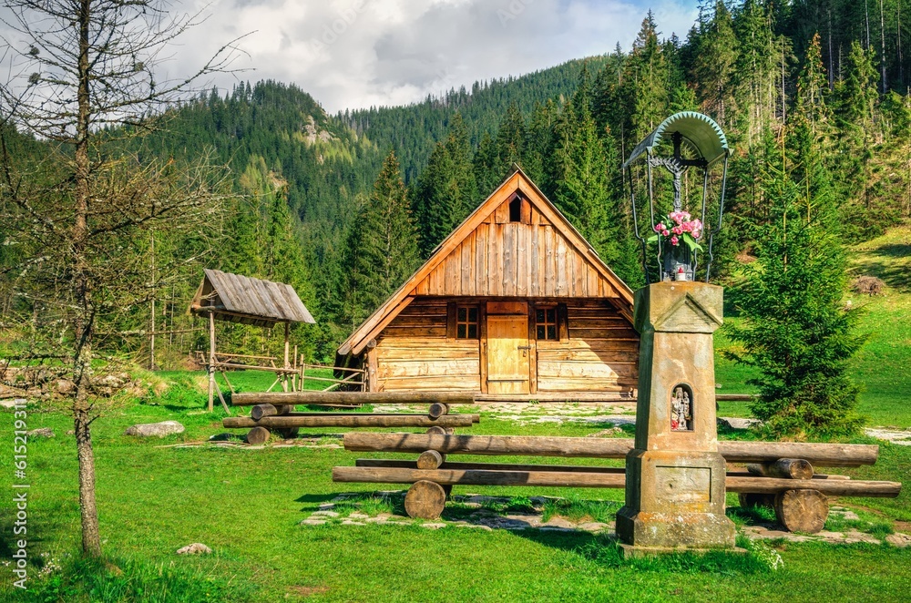 Spring rural landscape in the mountains. Wooden hut and shrine in beautiful mountain valley in Western Tatra, Poland.