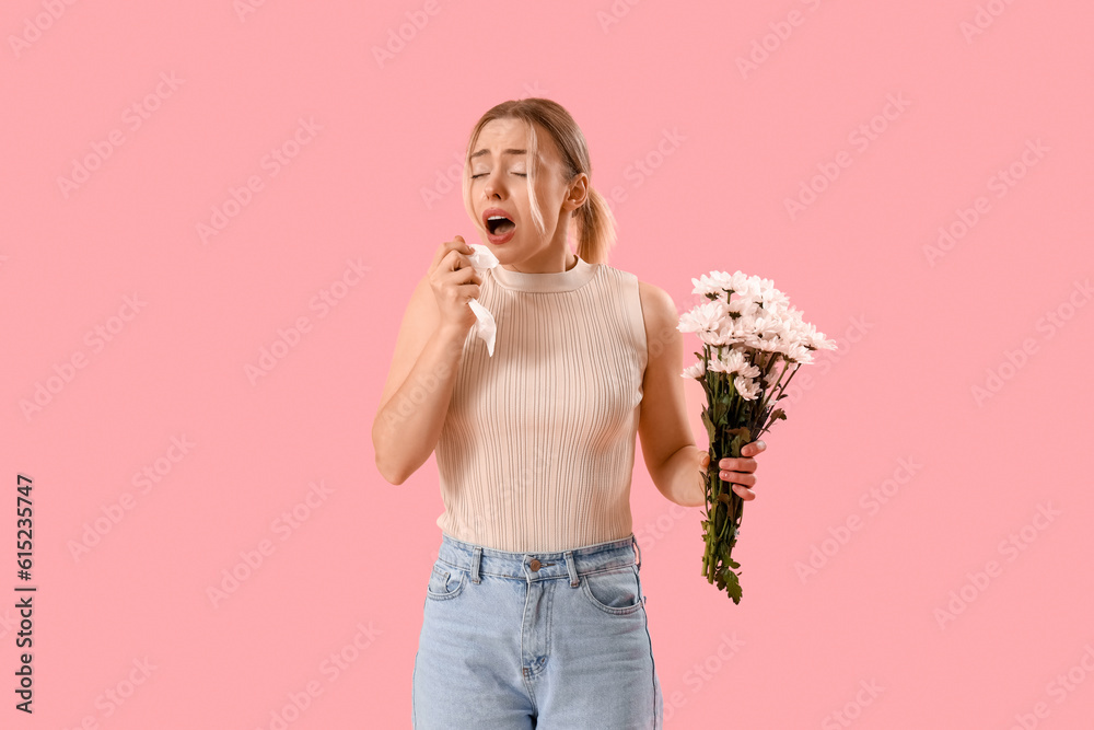 Allergic young woman with flowers on pink background