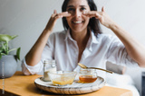 Latin woman applying facial mask on face for exfoliation at home in Mexico Latin America, hispanic people