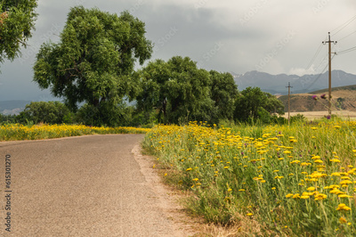 Thickets of yellow flowers along the road. Achillea filipendulina in the wild.