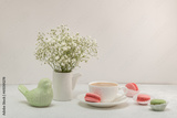 Coffee, colorful macaroons, a bouquet of gypsophila and a porcelain figurine of a bird on a white table. Cozy summer or spring breakfast.