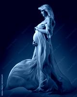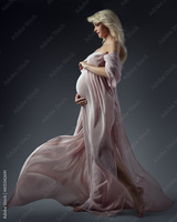 Beautiful Pregnant Woman looking at Belly in Waving Dress Side view. Happy Mother Profile Portrait embracing Abdomen in Pink Gown over Dark Gray