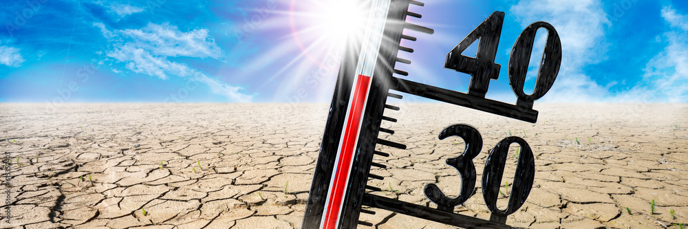 thermometer shows high temperature in summer heat with dryness and lack of water in field