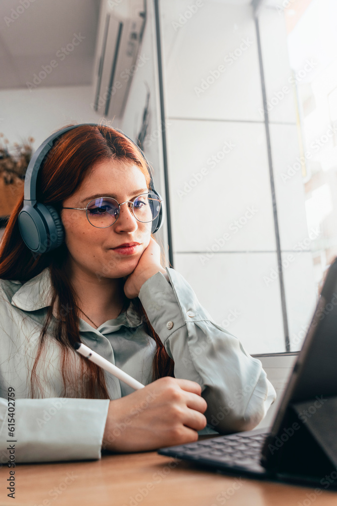Redhead Girl. Redhead's Café Retreat: A Haven for Remote Work Success