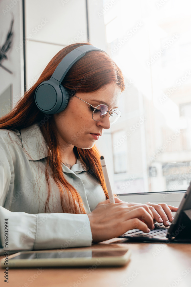 Redhead Girl. Redhead's Remote Symphony: Talent, Technology, and Café Ambiance