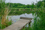 Pomost drewniany wystający nad taflę wody, otoczony zielenią traw i drzew