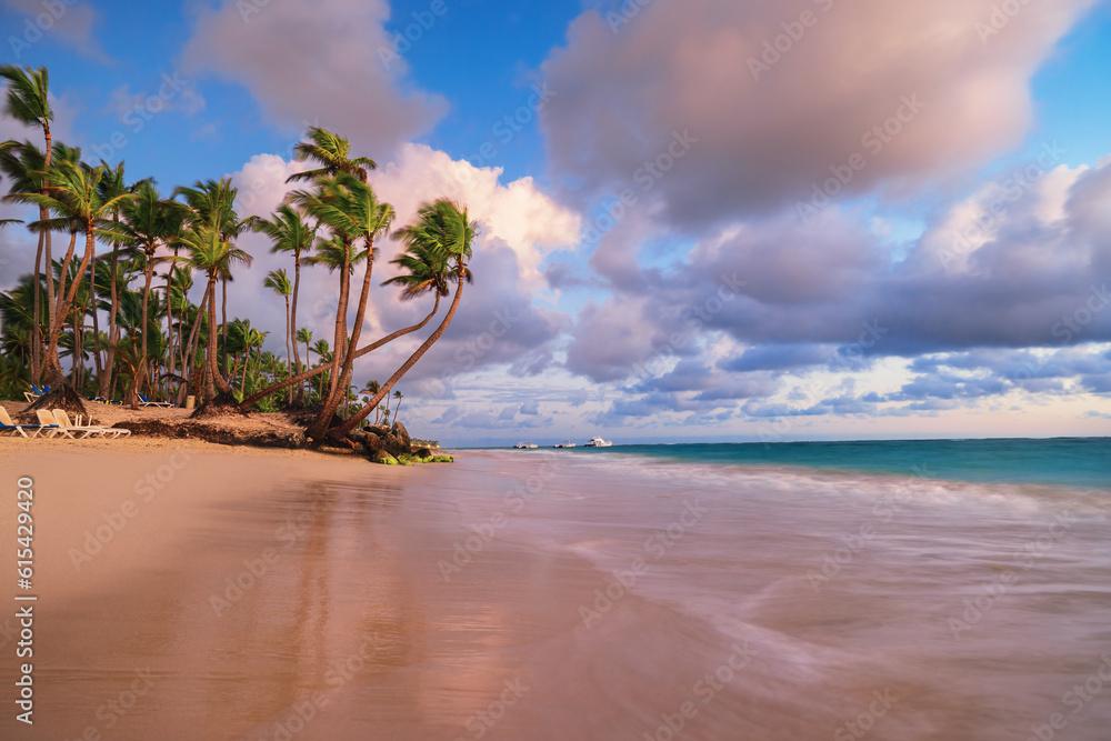 Palm trees on tropical islandbeach at sunset or sunrise with dramatic clouds and tropical Caribbean sea