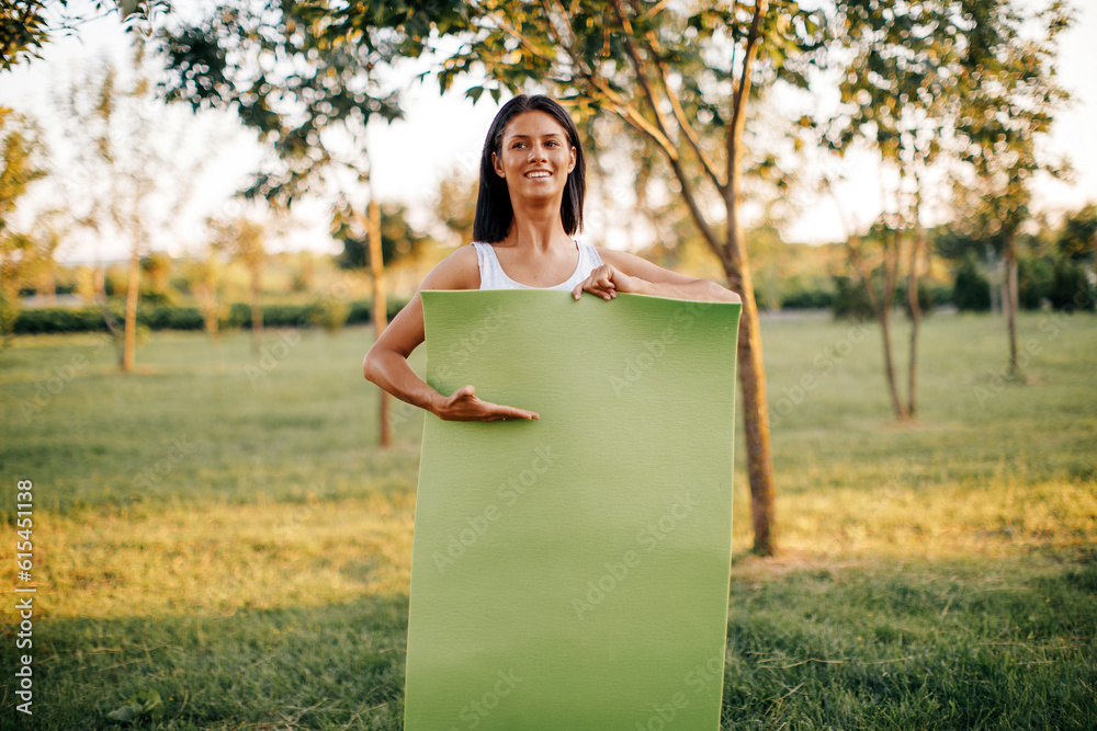 Close-up of a woman's hands rolling up an exercise mat and getting ready for a yoga class.