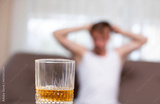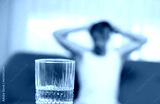 glass with a depressed man in the background