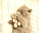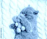 Playful kitten hugs favorite toy bear under white warm blanket on a bed at home.Top down view