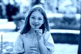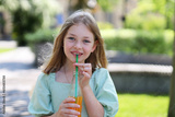 Smiling little girl drinks a cocktail from a bottle with a straw.