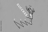 Collage picture of delighted black white effect girl raise fists attainment success path target flags ups downs isolated on orange background