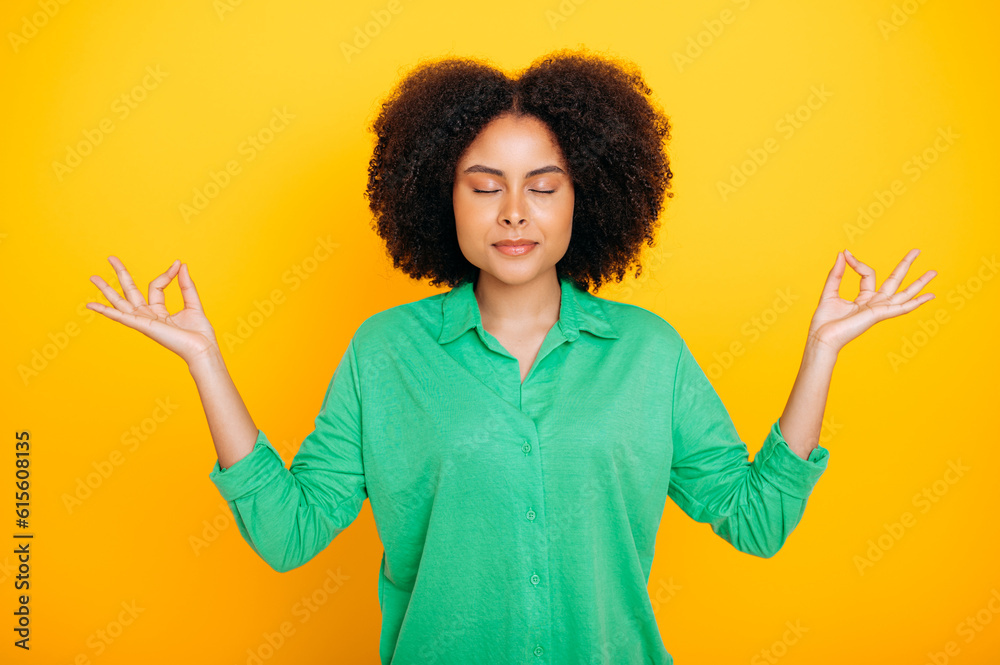 Photo of a lovely calm african american or brazilian curly haired woman in a green casual shirt, meditating while standing with closed eyes on isolated yellow background. Mental health, harmony, relax