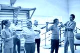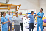 Elderly people doing workout with instructor in fitness class