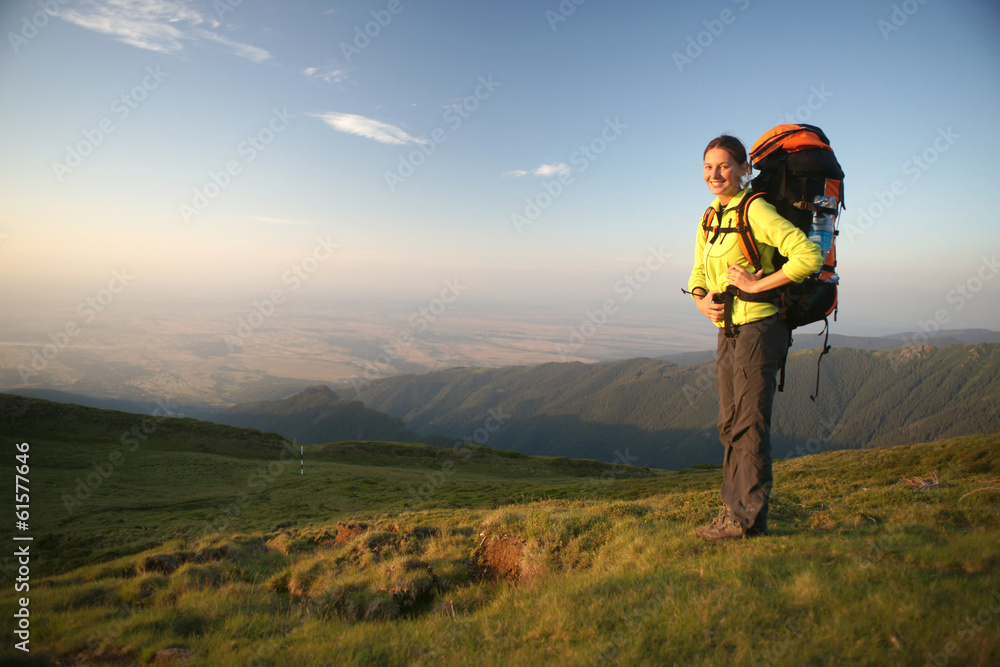 Hiker women standing in the mountains in the sunset.