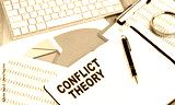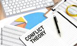 CONFLICT THEORY text on notebook with chart and keyboard