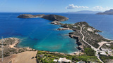 Aerial drone photo of paradise secluded beach of Agios Petros located in long peninsula of small island of Schoinousa, Small Cyclades, Greece