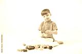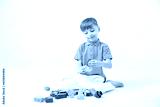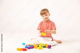 A happy child collects a tower of colored cubes. The preschooler sits down at the white background and assembles the construction set. The boy smiles, pleased with the result.
