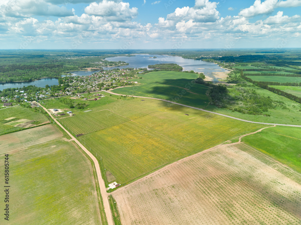 Large beautiful green apple orchard in summer