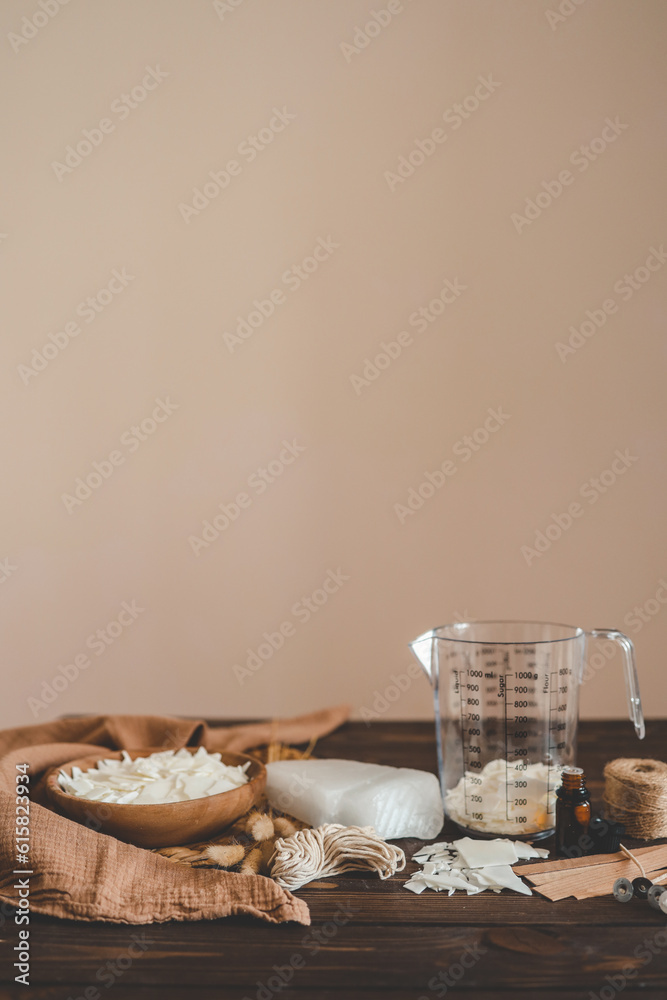 Set for crafting candle on white background. Eco soy wax and candle making tools. DIY candles. Hobby concept