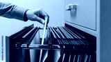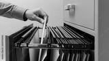 Office clerk searching for files into a filing cabinet drawer close up, business administration and data storage concept