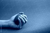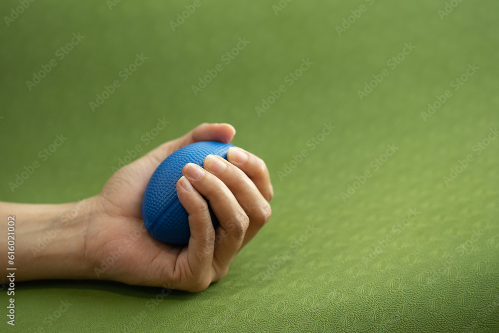 Hands of a man squeezing a blue stress ball on the yoga mat