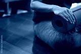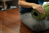 Young woman holding a yoga mat in exercise class for a sport and healthy concept