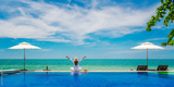 Wide panorama happy traveler woman on edge infinity pool joy fun nature view scenic landscape, Leisure time tourist travel Phuket Thailand summer holiday vacation, Tourism beautiful destination Asia