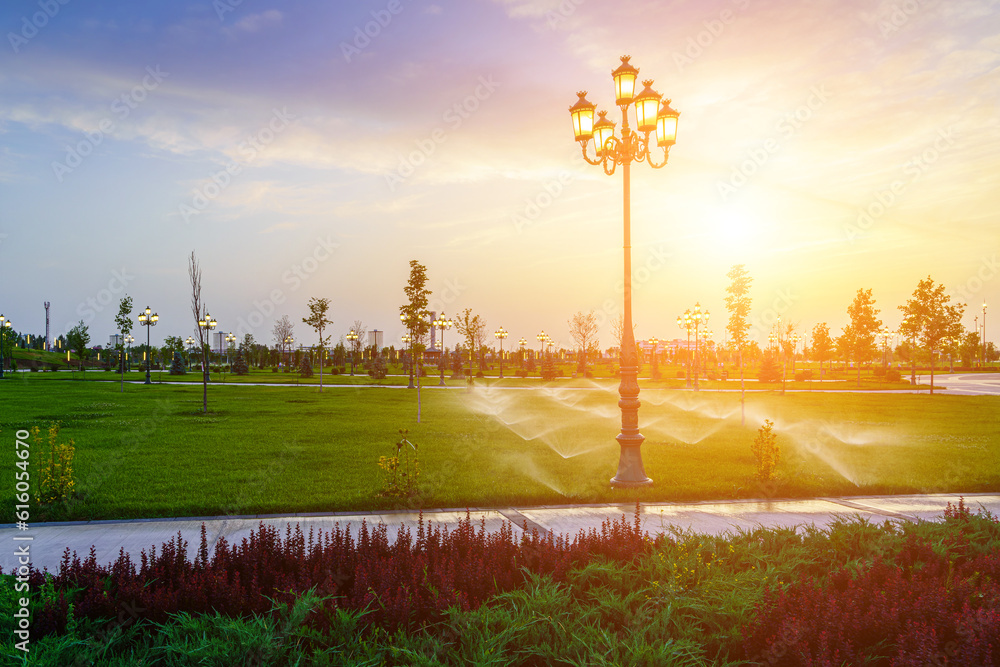 City park in early summer or spring with lanterns, young green lawn, trees and dramatic cloudy sky on a sunset or sunrise.