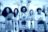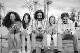 Group of best friends enjoying and smiling using their mobile phone app sitting on a bench sharing messages. Happy young people chatting on social media online with the cellphone having fun together