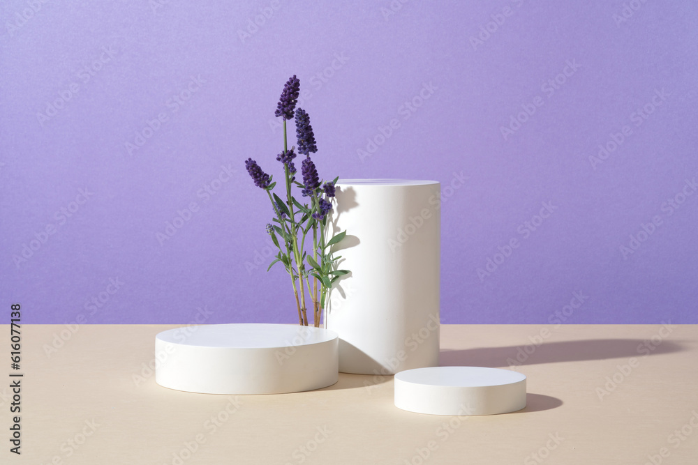 Three white podiums with blooming lavender on purple background. Abstract scene with minimalist style for product brand presentation. Lavender is a famous and popular flower around the world