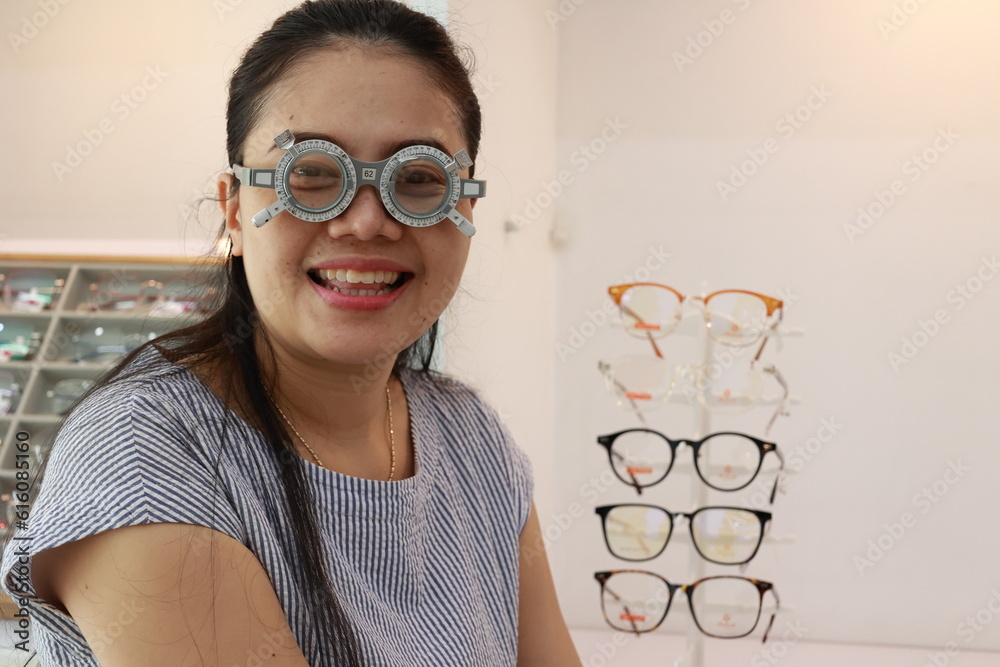 Woman wearing trial frame for eye test