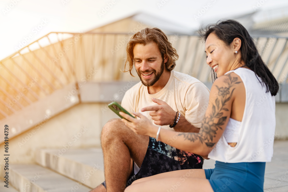 Young diverse urban couple sitting on stairs outdoors in the city, looking at a smartphone, communicating, having fun
