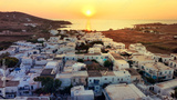Aerial drone photo of famous Venetian fortified castle of main village in Antiparos island at sunset, Cyclades, Greece