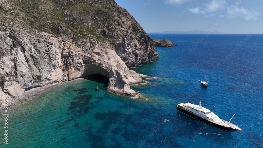 Aerial drone photo of beautiful turquoise beach and cave formations visited by yachts and sailboats in Southern part of Antiparos island, Cyclades, Greece