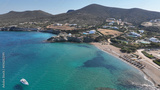 Aerial drone photo of paradise beach of Sostis with crystal clear sea, Antiaparos island, Cyclades, Greece