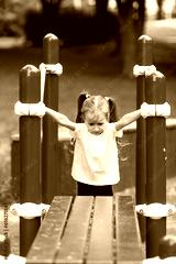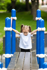 Sad tired little girl is engaged in sports simulators at the sport ground outdoors. Healthy lifestyle