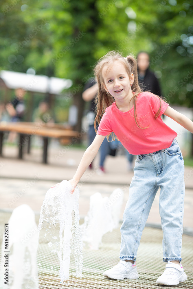 Happy little toddler girl running through a fountain having fun with water splashes, enjoying summer family vacation