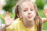 A little cute girl on the street on a summer day in the park. The baby looks at the camera. Happy childhood