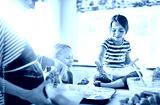 Mother, playing or happy kids baking in kitchen as a happy family with playful young siblings with flour. Dirty, messy or funny mom helping, cooking or teaching girls to bake for learning at home