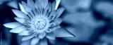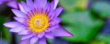 Nature closeup pink purple lotus water lily blooming on blurred water surface and dark green leaves. Wellbeing spa purity nature background. Relaxing nature blooming floral panorama, idyllic sunlight