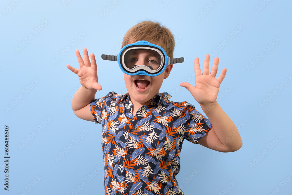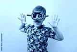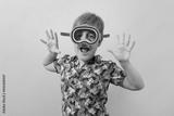 A boy in a diving mask in a Hawaiian shirt demonstrates rejoices in the holidays