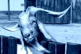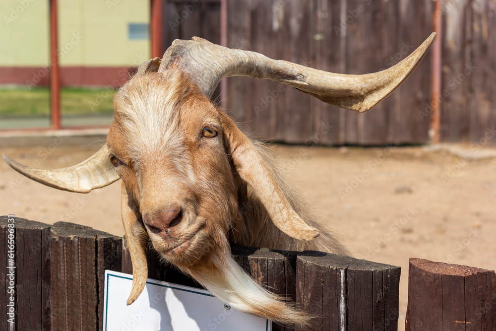 The brown goat's head is thrown over the fence.