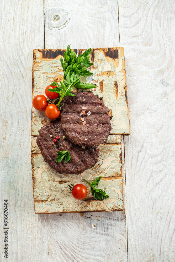 Griiled meat steak cutlets, Concept healthy and balanced eating. vertical image. top view. place for text