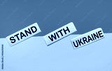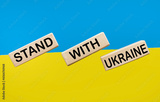 Wooden blocks with the text Stand for Ukraine on the table with the color of the flag of Ukraine