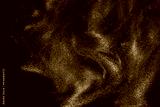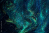 Various stains and overflows of gold particles in blue fluid with green tints. Golden particles dust and smooth defocused background. Liquid iridescent shiny backdrop with depth of field.
