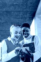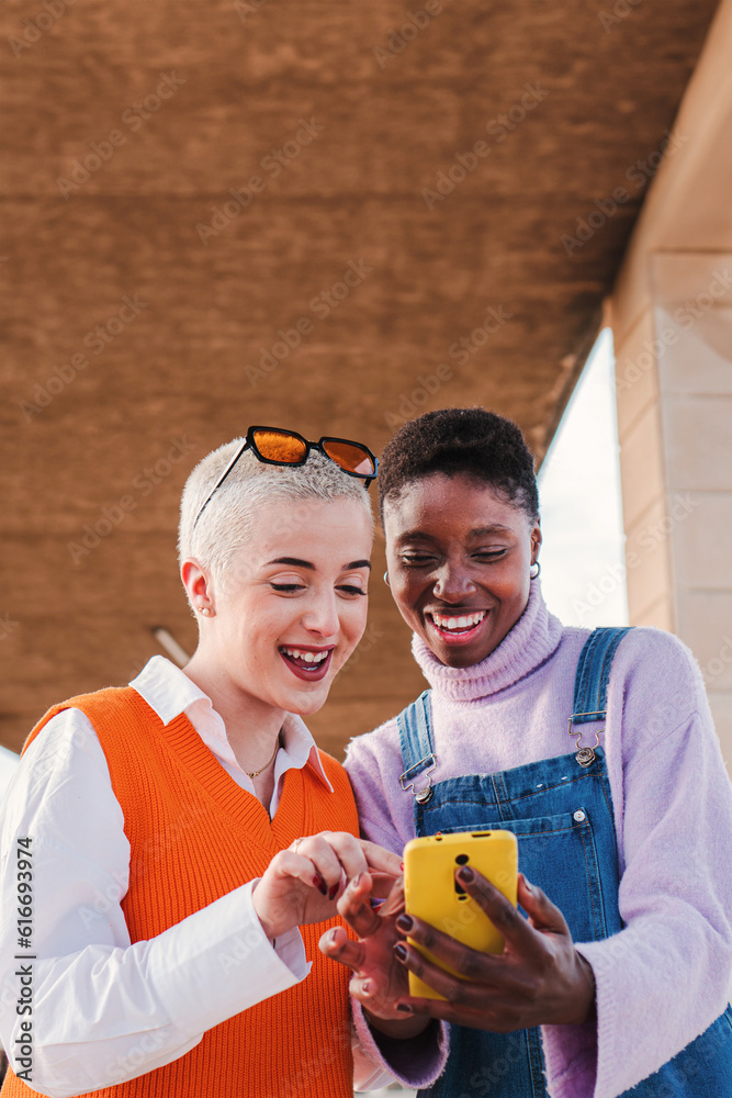 Vertical portrait of two happy women friends smiling and watching funny photos on a social media cellphone app. A pair of girls having fun together with a smart phone. Ladies using a mobile phone