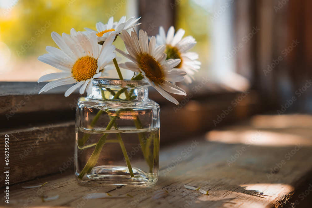 A close-up of a jar with a lush bud of a glass plant. Retro wooden rustic window sill.