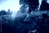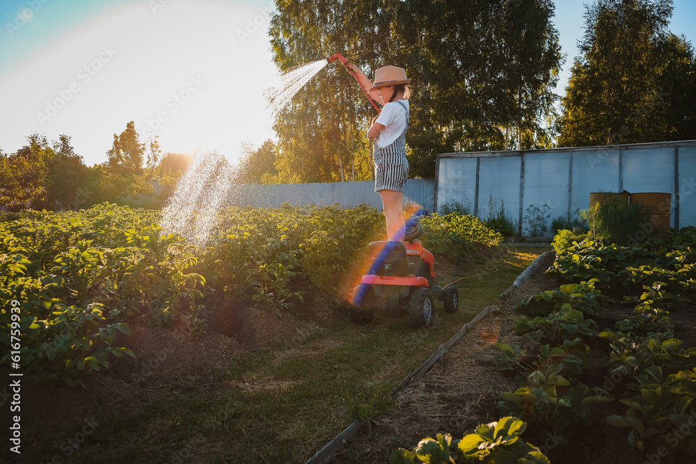 Child watering plants in garden. Kid with water hose in sunny backyard. Little girl gardening. Summer outdoor activities during the summer holidays in the village.