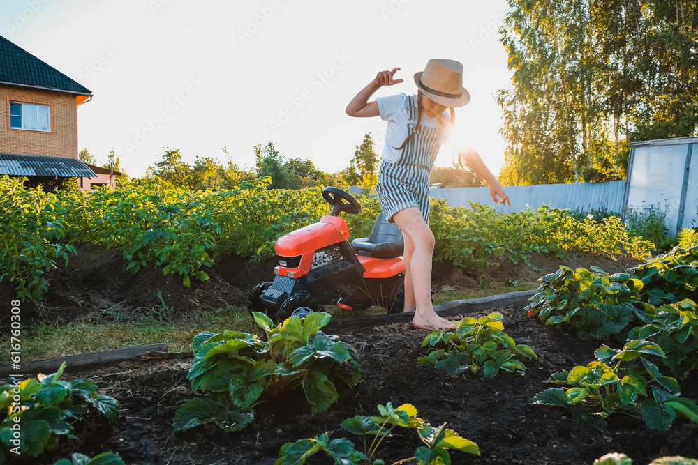 child girl admires the sunset standing on a pedal tractor in the backyard in the garden in the village.